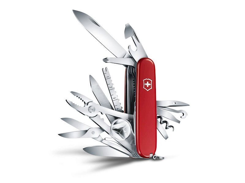 Funktionen Sackmesser: | Allgemein>Mehrzweckhaken , Allgemein>Näh-Ahle, Büro>Kugelschreiber , Büro>Lupe , Büro>Massstab mm , Büro>Massstab Zoll , Büro>Schere , Fischen>Angellöser , Fischen>Fischentschupper , Körperpflege>Nagelfeile , Körperpflege>Nagelreiniger , Körperpflege>Pinzette , Körperpflege>Zahnstocher , Küche>Dosenöffner , Küche>Flaschenöffner , Küche>Korkenzieher , Schneiden>Klinge gross , Schneiden>Klinge klein , Tragen>Ring , Werkzeug Elektriker>Drahtabisolierer , Werkzeug Elektriker>Drahtschneider , Werkzeug Holz>Holzmeissel , Werkzeug Holz>Holzsäge , Werkzeug Metall>Metallfeile , Werkzeug Metall>Metallsäge , Werkzeug Schraubendreher>Kreuz Phillips GR 2 , Werkzeug>Hülsenpresser , Werkzeug>Nadel , Werkzeug>Stech/Bohr-Ahle , Werkzeug>Zange , Werkzeug Schraubendreher>Schlitz 1.5 mm , Werkzeug Schraubendreher>Schlitz 2 mm (GR 00) , Werkzeug Schraubendreher>Schlitz 3 mm  |