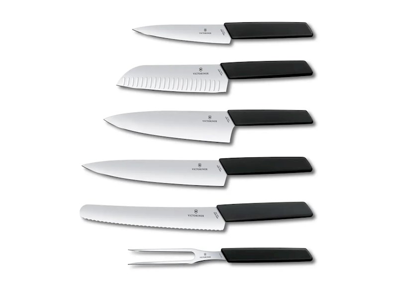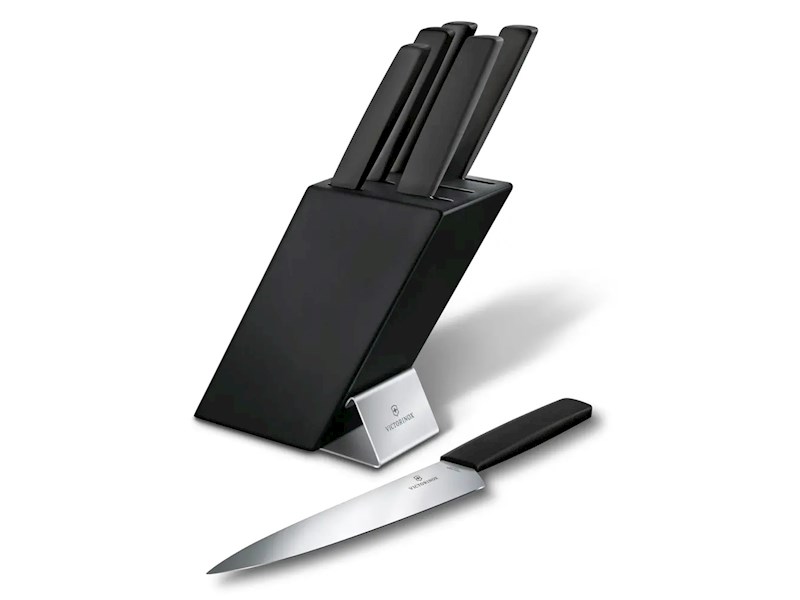 Der Swiss Modern Messerblock verleiht Ihrer Küche einen gehobenen, edlen Touch. Der Block selbst ist aus wunderschönem Buchenholz gefertigt und für ein modernes Finish anthrazitfarben lackiert – schon jetzt ein Designklassiker. Seine geometrische, schräge Silhouette greift die Form der sechs einzigartigen Küchenwerkzeuge mit Nussbaumholzgriffen auf, die darin Platz finden. Abgerundet wird das Design durch ein graviertes Victorinox Logo. Leer oder gefüllt mit fünf Messern und einer Gabel erhältlich. Für einen coolen Look in Ihrer Küche.